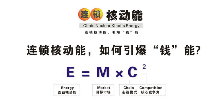 ,這是世界著名的愛因斯坦能量公式。基于愛因斯坦的相對論和能量公式,產生了原子彈和核電站,今天的人類太空實踐證實了愛因斯坦理論的正確性,人類因此發(fā)生了翻天覆地的變化。在愛因斯坦的能量公式中,M是質量,C是光速,當速度為光速時,即使很小的質量也能轉化為非常大的能量。 廣州采納企業(yè)管理顧問有限公司首席咨詢師陳宏創(chuàng)建的的連鎖核動能理論(全名:連鎖內核能量裂變激增理論)是以愛因斯坦的能量公式為基礎創(chuàng)建,但其含義和指向是不同的:M=目標市場(Market),C1=連鎖模式(Chain),C2 =核心競爭力(Competition),其理論意義是,企業(yè)找準了目標市場,以連鎖的方式經營,核心競爭力越大,推動其發(fā)展能量就越大。 連鎖核動能理論如何幫助連鎖企業(yè)“引爆錢能”快速發(fā)展?我們用深入淺出的圖形表達方式對該理論進行分層闡述: